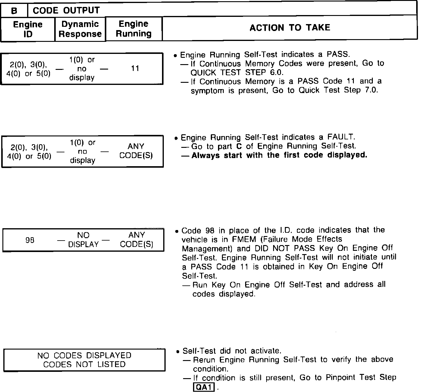 ^ Continuous Memory Codes recorded in this step will be used for diagnosis in Step 6.0 after a PASS code 11 is received in both the Key On Engine Off and the Engine Running Self-Tests.