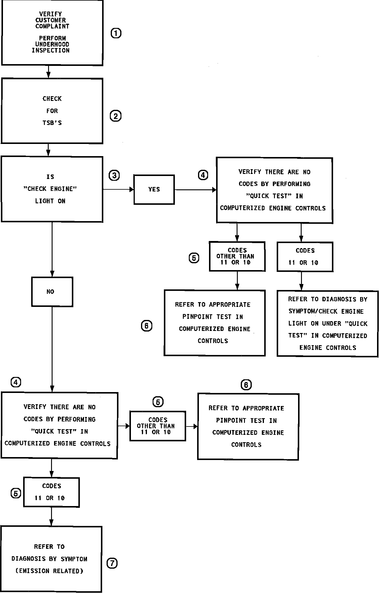 7 See DIAGNOSIS BY SYMPTOM - EMISSION RELATED under TESTING PROCEDURES for symptom vehicle is exhibiting. Follow the procedures as outlined for given symptom.