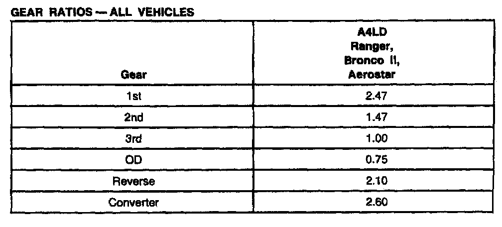 A4LD 4-spd A/T, Gear Ratios (Ranger/Bronco II/ Aerostar):