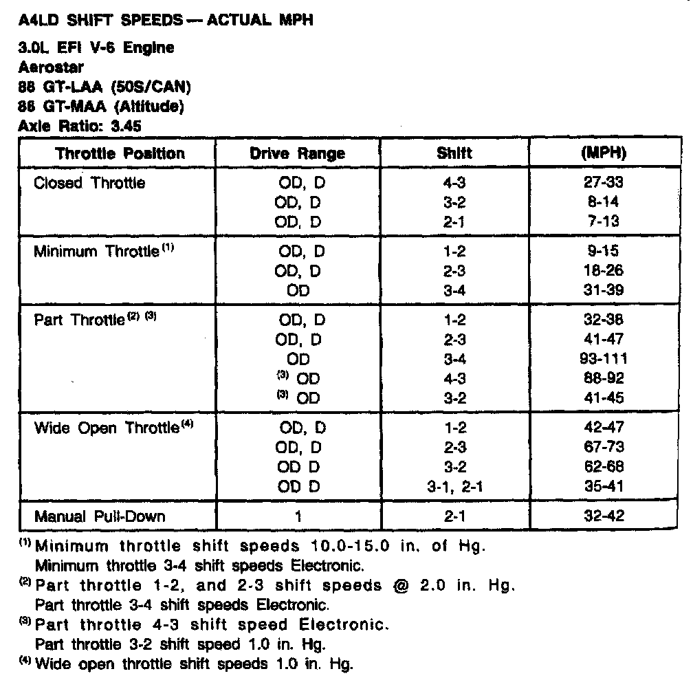 A4LD 4-spd A/T, Shift Speeds (3.0L Aerostar):