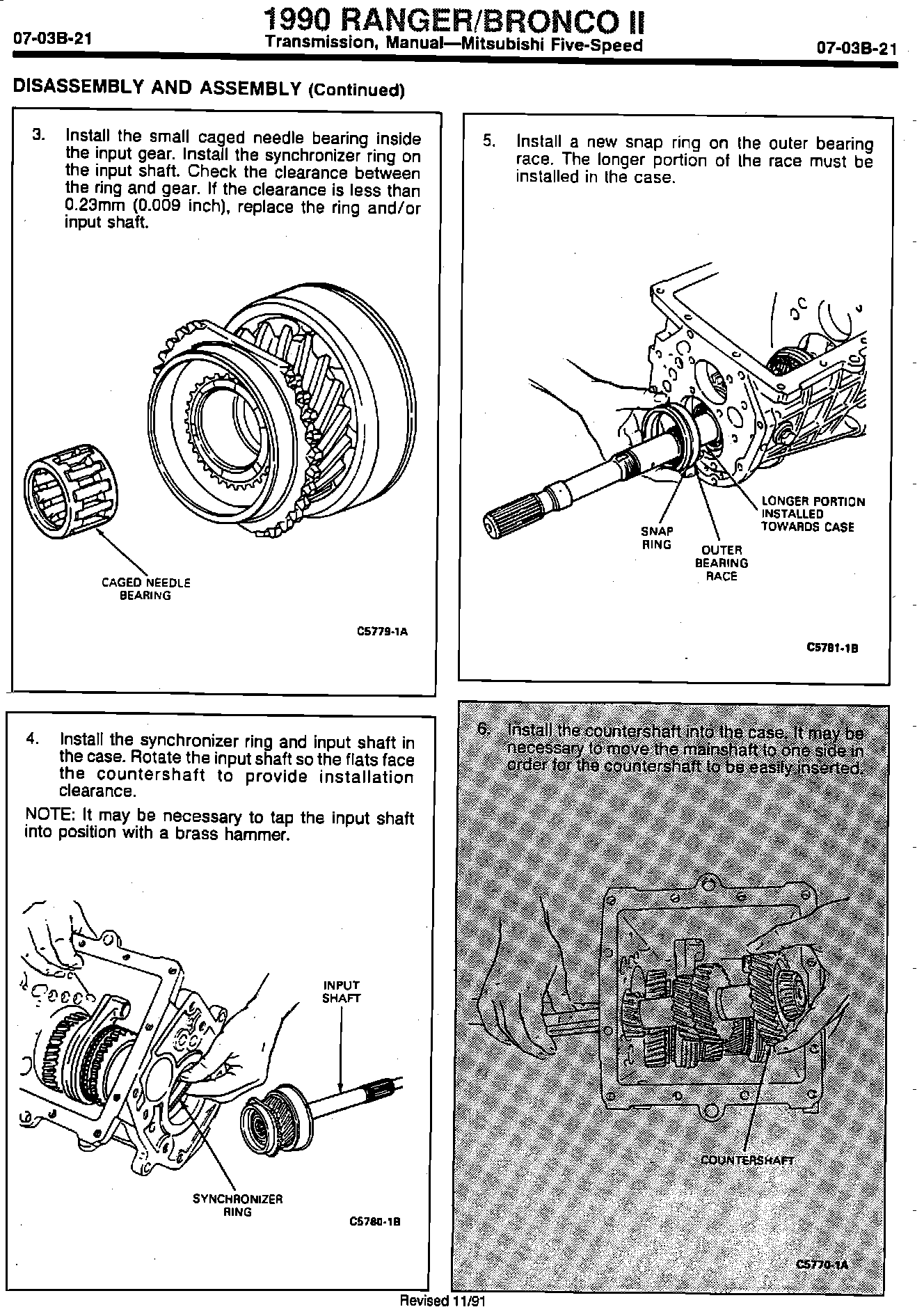ISSUE: The Mitsubishi Five-Speed Manual Transmission Assembly Procedure requires a change in step sequence to permit movement of the mainshaft to assemble the countershaft. The following Shop Manuals are affected on the pages indicated: