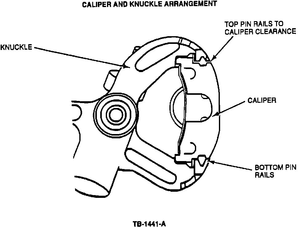 b. While holding the caliper in place against the bottom pin rails, Figure 1, measure the clearance between the caliper and the top pin rails. Clearance should be a minimum of .015 ".