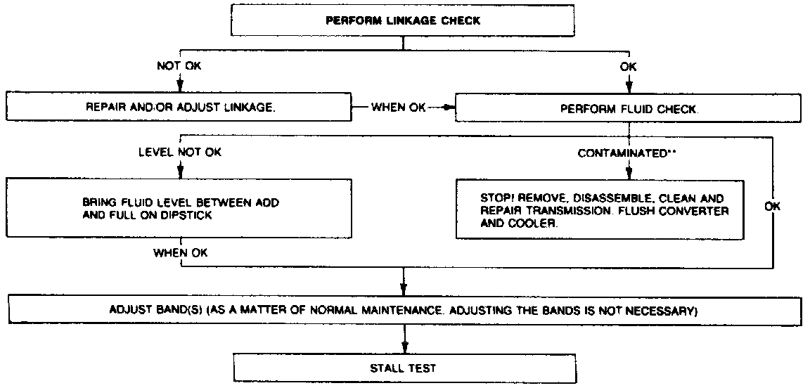 NOTE: The stall test checks converter one-way clutch operation and installation, the holding ability of the forward clutch, reverse clutch, the low and reverse bands, the planetary one-way clutch, and engine performance. Perform test with engine coolant and transmission fluid at operating temperature. Prepare for stall test as shown in the Stall Test Preparation Chart.