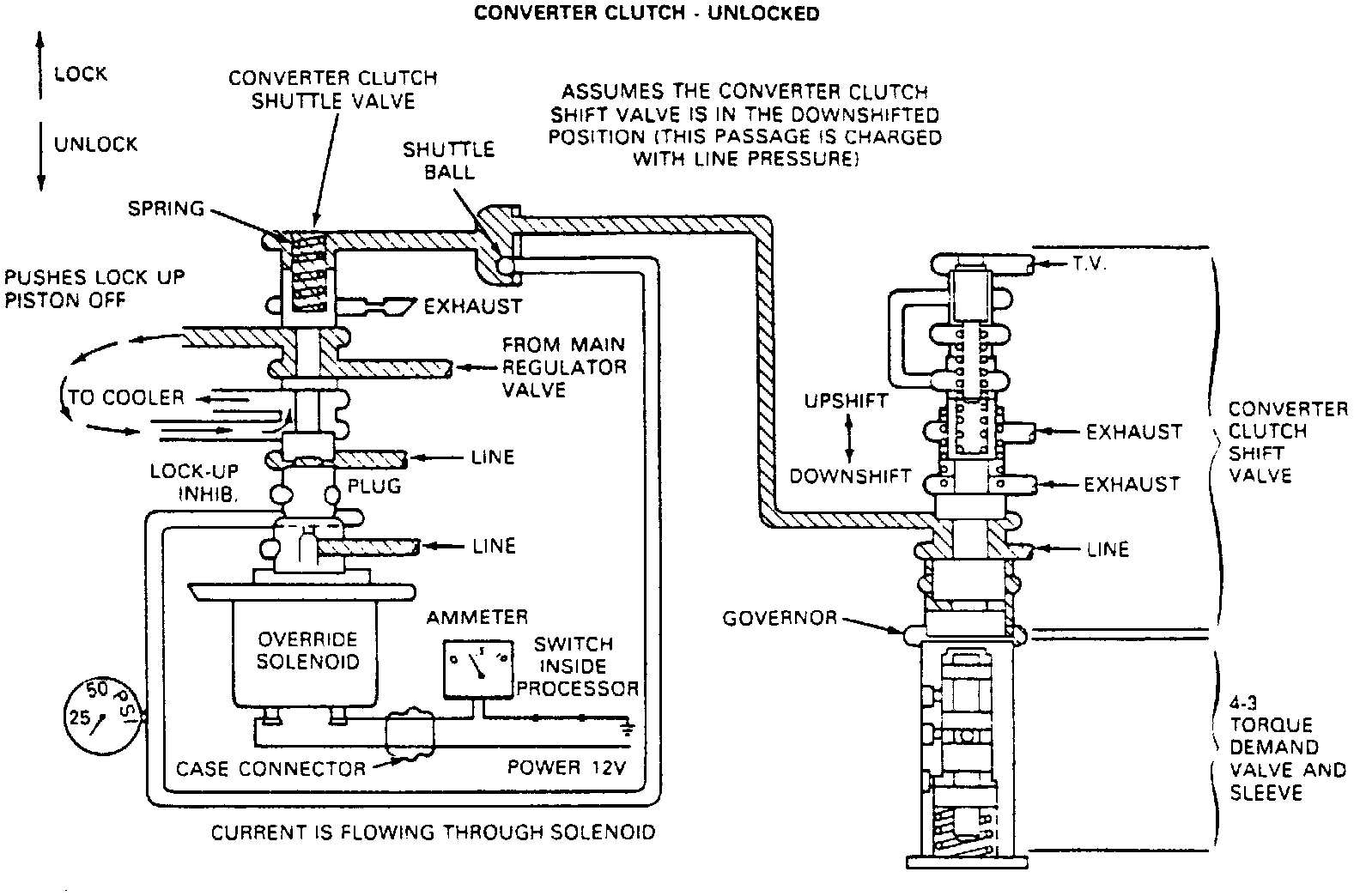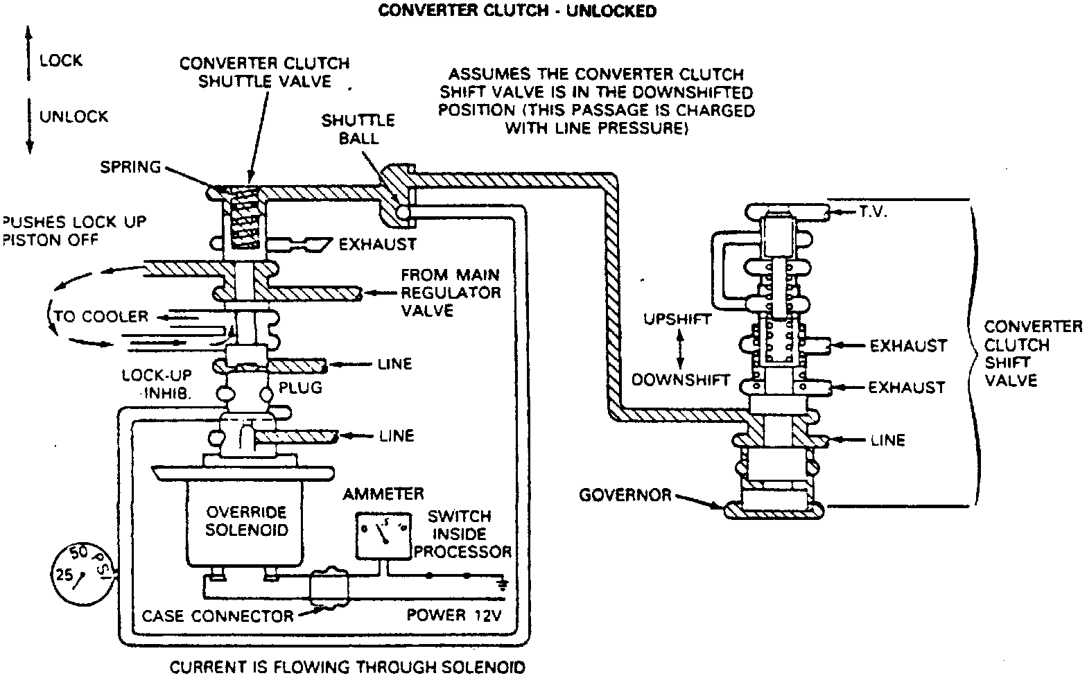3. When the converter clutch shuttle valve is resting on the plug, line pressure is directed through the shuttle valve and to the torque converter in a flow path that pushes the lockup piston off. When line pressure on the spring end of the converter clutch shuttle valve is exhausted, line pressure on the plug end of the valve forces the valve to move and compress the spring. Governor pressure acting on the converter clutch shift valve has not yet moved the valve to the upshifted position. Line pressure is therefore acting on the spring end of the converter clutch shuttle valve. The torque converter is therefore unlocked.