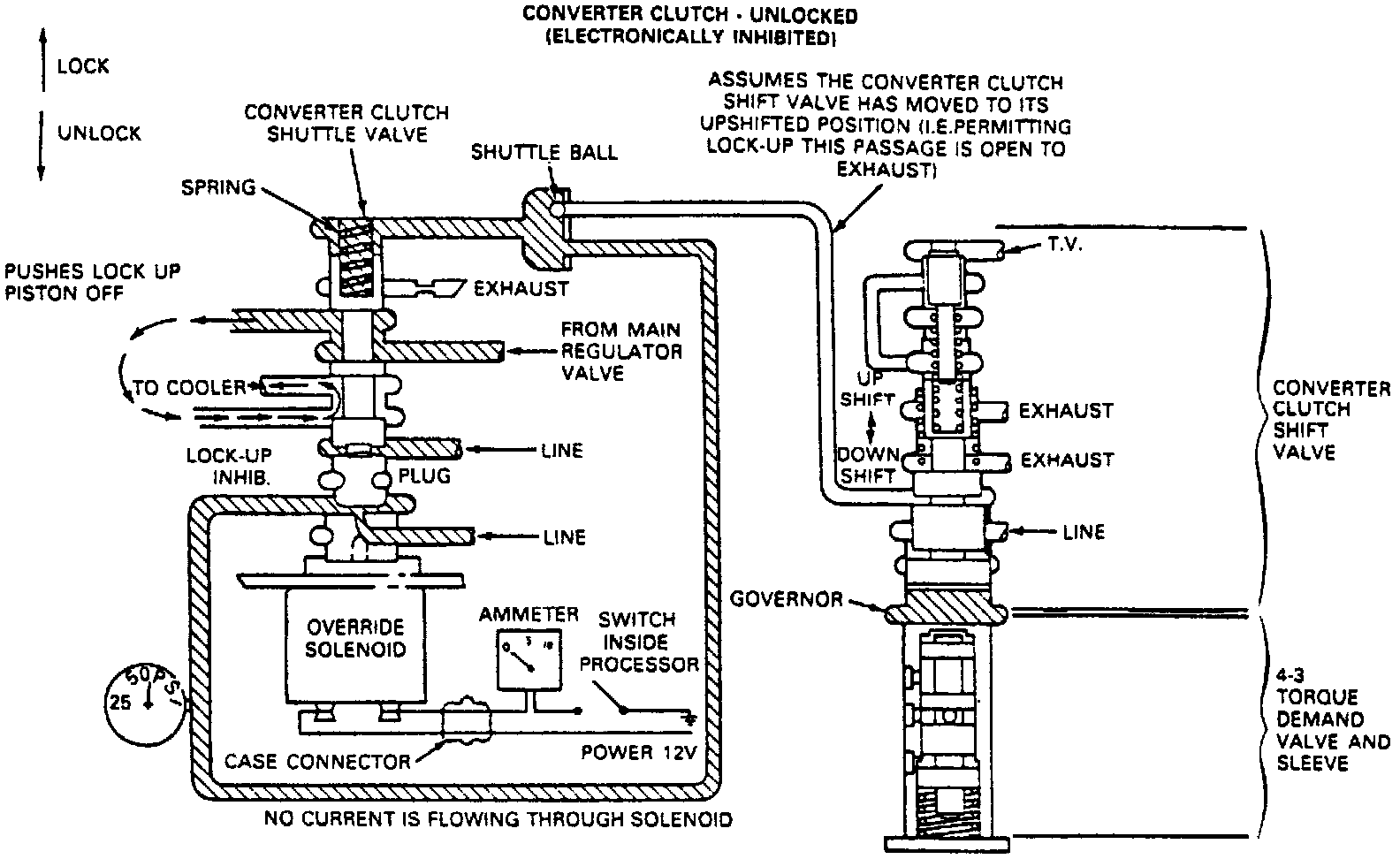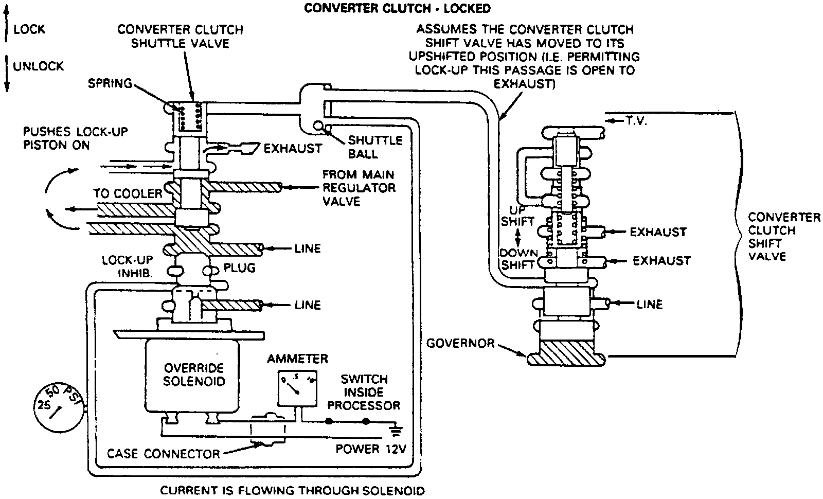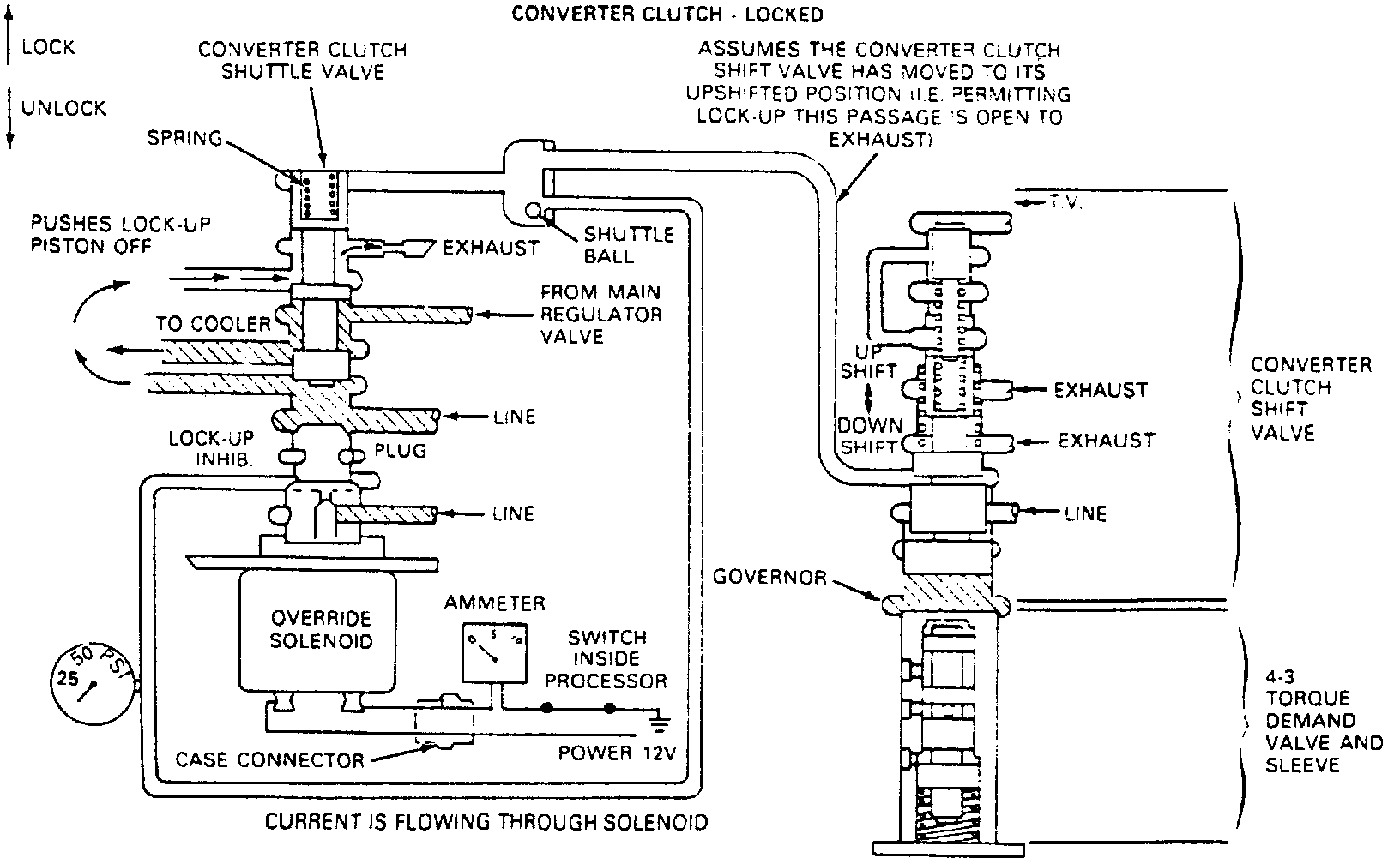 2. Converter clutch engagements and disengagements are scheduled hydraulically but can be overridden electronically. The converter clutch is inhibited from engaging when engine coolant temperature is below 128° F or above 24O° F, during heavy brake application, at closed throttle, during heavy or wide open throttle acceleration, during quick tip-ins or tip-outs, or when actual engine speed is below a certain value at lower vacuums. During these modes, no current flows through the solenoid.