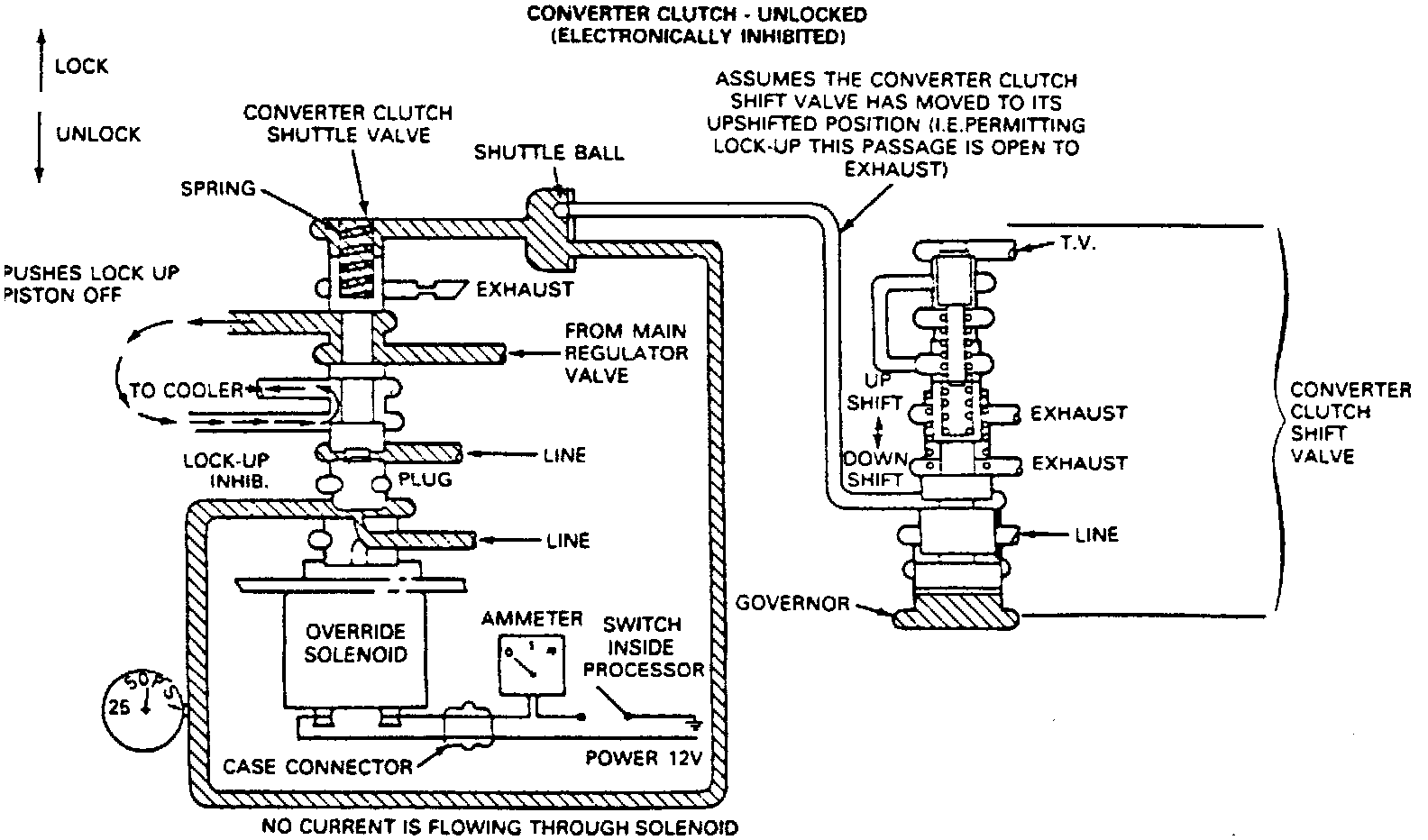 6. With no current to the solenoid, line pressure can flow through the solenoid valving and enter the lockup inhibition passage. Line pressure in the inhibition passage forces the shuttle ball to take its position. The shuttle valve moves against the plug and the converter unlocks. Since this is a hybrid system, it will often be necessary to check both the hydraulic and electronic portions of the system.