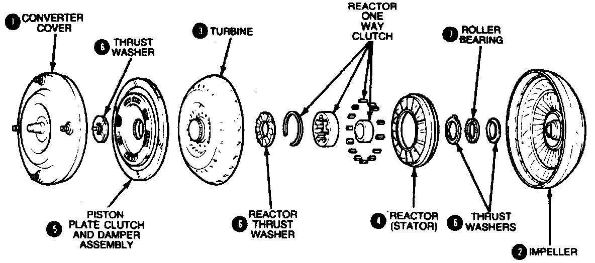 2. The impeller (2) is the pumping member for fluid coupling and torque multiplication. It is welded to and driven by the cover. Its rear hub drives the transmission oil pump.