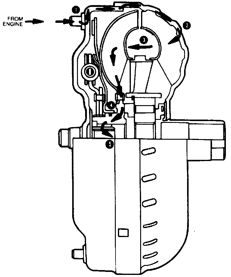 2. The impeller is driven at engine speed. Fluid is supplied from the valve body to the spaces between the vanes. Centrifugal force causes the fluid to be set in motion and forced out of the openings around the inner ring. The fluid is directed toward the turbine vanes. Striking the turbine vanes, the fluid causes it to turn in the same direction as the impeller. The fluid flows around the turbines' inner ring and is directed to the reactor. The reactor is held stationary by its one-way clutch. Its vanes direct the fluid back to the impeller in a direction that assists the impeller. The impeller again accelerates the fluid and returns it to the turbine with increased energy.