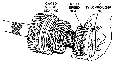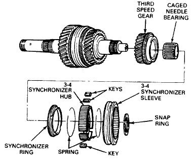 2. Remove the 3-4 synchronizer assembly (hub, sleeve, spring and keys), synchronizer ring, third speed gear and caged needle bearing from the front of the mainshaft. Note the position of the synchronizer hub and sleeve during disassembly.