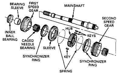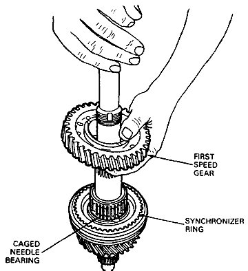 4. Separate the inner ball bearing, bearing sleeve, first speed gear, caged needle bearing, 1-2 synchronizer assembly (hub, sleeve two springs and three keys), second speed gear and caged needle bearing. Note the direction of 1-2 synchronizer hub and sleeve during disassembly. Discard the inner ball bearing.