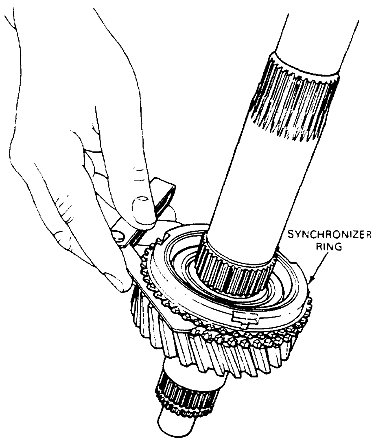 1. Check the clearance between the synchronizer rings and gears. Install the ring on the gear and insert a feeler gauge between the ring teeth and gear. If the clearance is less than 0.23 mm (0.009 inch), replace the ring and/or gear.