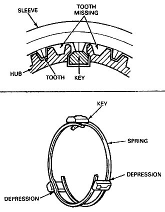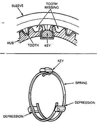d. The synchronizer sleeve has a tooth missing at six positions. Assemble the hub to the sleeve so the single tooth between the two missing portions will touch the synchronizer key.