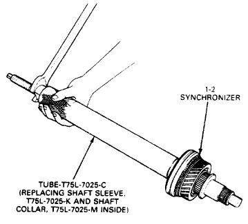 6. Press the 1-2 synchronizer assembly in position on the mainshaft using Replacing Shaft Sleeve, T75L-7025-K, Shaft Collar, T75L-7025-M and Tube, T75L-7025-C or equivalent. If properly installed, the second speed gear should rotate freely.