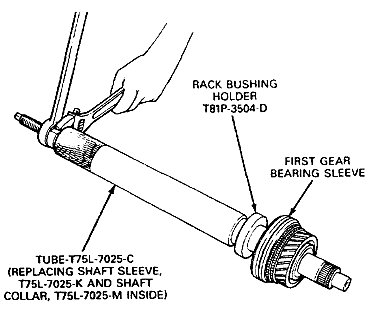 7. Position the first gear bearing sleeve on the mainshaft. Press the sleeve on the shaft using Replacing Shaft Sleeve, T75L7O25-K, Shaft Collar, T75L-7025-M, Rack Bushing Holder, T81P-35O4-D (or an appropriate washer) and Tube, T75L-7025-C. When properly installed, the sleeve should be against the synchronizer hub. Make sure the gears rotate freely.