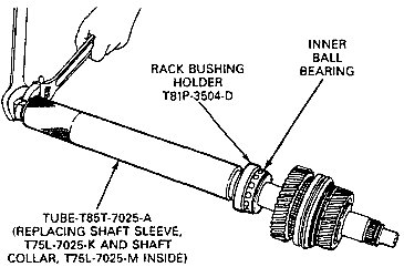 11. Press the inner ball bearing on the mainshaft using Rack Bushing Holder, T81P-3504-D (or an appropriate size washer), Tube, T85T-7025-A, Replacing Shaft Sleeve, T75L-7025-K, and Shaft Collar, T75L-7025-M. When properly installed, the gears should rotate freely.