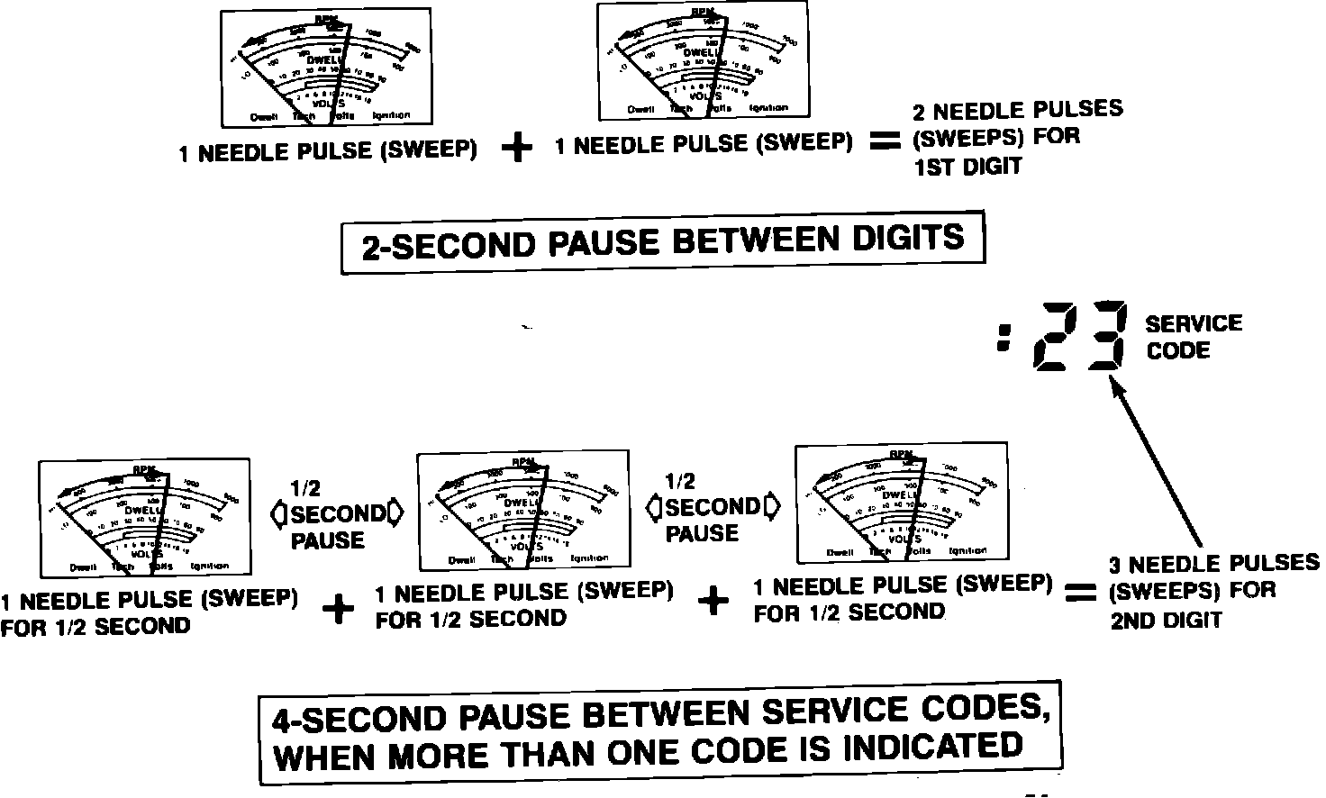When a service code is reported on the analog voltmeter for a functional test, it will represent itself as a pulsing or sweeping movement of the voltmeter's needle across the dial face, Fig. 28. A single digit of three will be reported by three needle pulses (sweeps). However as previously stated, a service code is represented by a two digit number, such as 2-3. The self-test service code of 2-3 will appear on the voltmeter as two needle pulses (sweeps), then after a two second pause, the needle will pulse (sweep) three times. The continuous testing codes are separated from the functional codes by a six-second delay, a single half-second sweep and another six-second delay. They are produced on the voltmeter in the same manner as the functional codes.