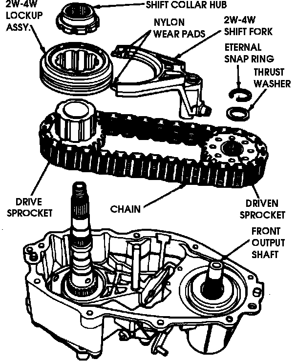 27. Install chain, drive sprocket and driven sprocket assembly over shafts. Install thrust washer on front output shaft, then the external snap ring over thrust washer.