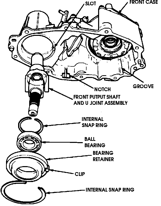 9. Install front output shaft and U-joint assembly through front case seal, then install the ball bearing and retainer assembly and internal snap ring. The clip on bearing retainer must align with slot in front case, Fig. 15.