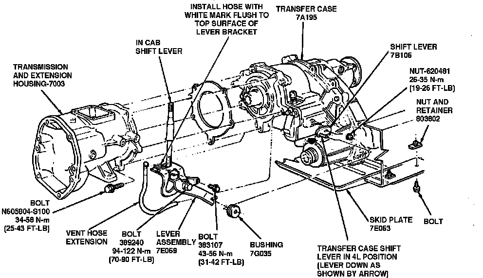 c. Torque shifter to extension housing retaining bolt to 31-42 ft. lbs. and shoulder bolt to 70-90 ft. lbs. The shifter retaining bolt must be tightened before the shoulder bolt.