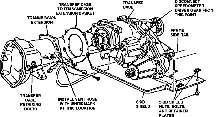d. Torque speedometer driven gear attaching screw to 20-25 inch lbs., front and rear driveshaft retaining bolts to 12-15 ft. lbs., fill and drain plugs to 14-22 ft. lbs. and (mechanical shift) skid plate retaining bolts to 22-30 ft. lbs, (electronic shift) skid plate retaining bolts to 15--20 ft. lbs.