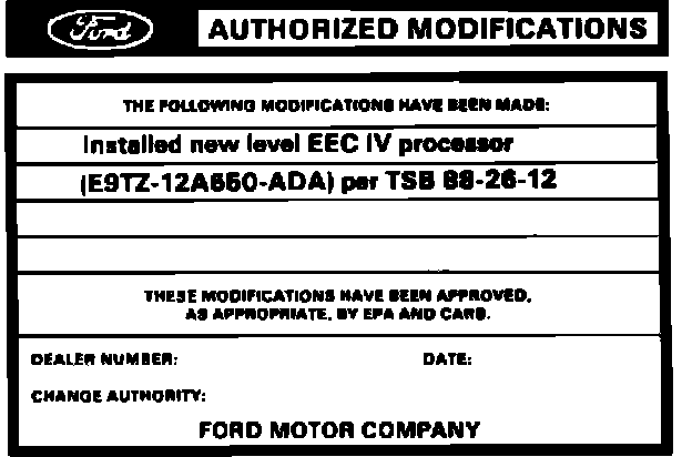 Obtain an Authorized Modification Decal and list the date, dealer number, and summary of alterations performed. Select a prominent place adjacent to the Vehicle Emission Control Information Decal suitable for installing the Authorized Modification Decal. Clean the area, install the decal and cover it with a clear plastic decal shield.