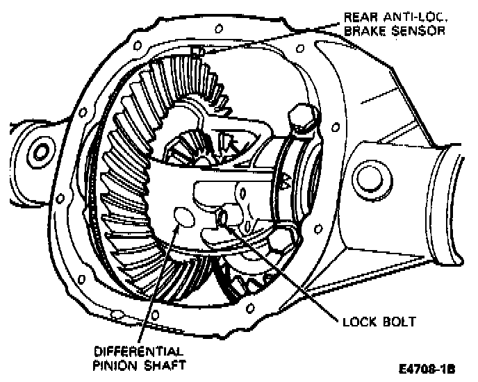 3. Position the differential pinion shaft through the case and pinions, aligning the hole in the shaft with the lock bolt hole. Apply Stud and Bearing Mount, EOAZ-19554-B (ESE-M4G167-A2) or equivalent to the lock bolt threads. Install lock bolt and tighten to 20-40 Nm (15-30 ft-lbs).