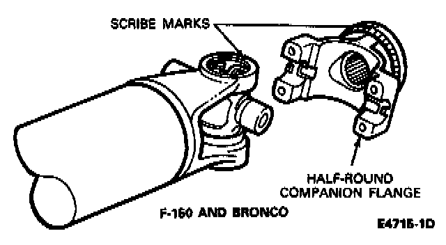 4. Remove the oil seal replacer from the transmission extension housing. Install the driveshaft in the extension housing. Align the scribe marks on the flange and driveshaft and connect the driveshaft at the axle companion flange. Tighten attaching bolts and nuts to companion flange, (8-15 ft-lbs). For half round companion flange and 95-128 Nm (70-95 ft-lb) for circular companion flange.