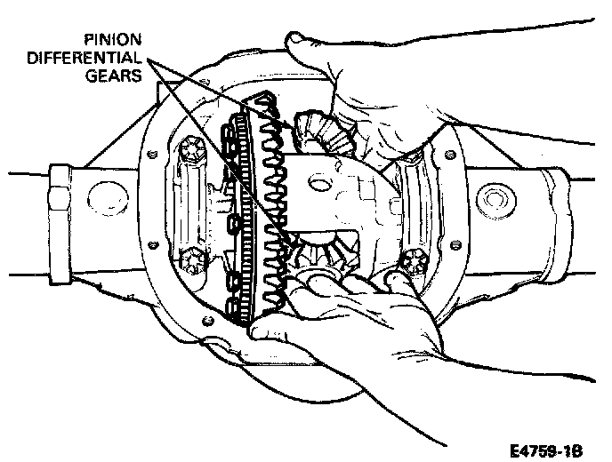 2. Position the differential pinion gears and thrust washers (180° apart) to the differential side gears. Turn the gear assembly to move the pinion gears and thrust washers into the proper position in the differential case (washer and pinion gear bores aligned with pinion shaft holes in case).