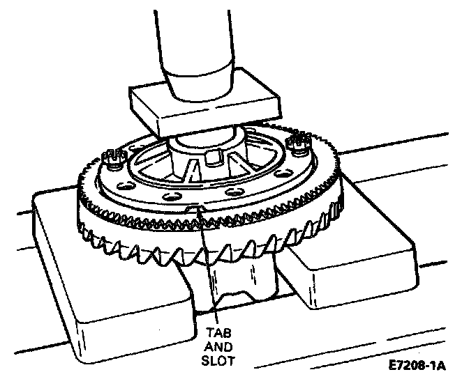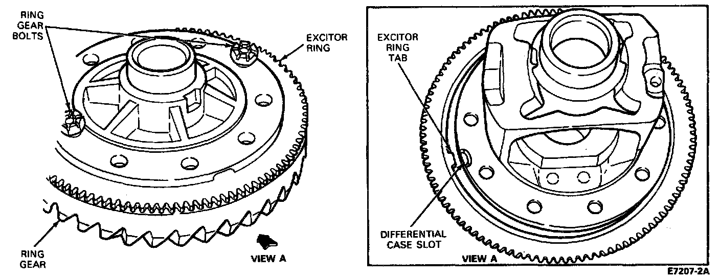 Align tab on excitor ring with slot in differential case. Start two ring gear bolts through the case into the ring gear to ensure case to ring gear bolt hole alignment.