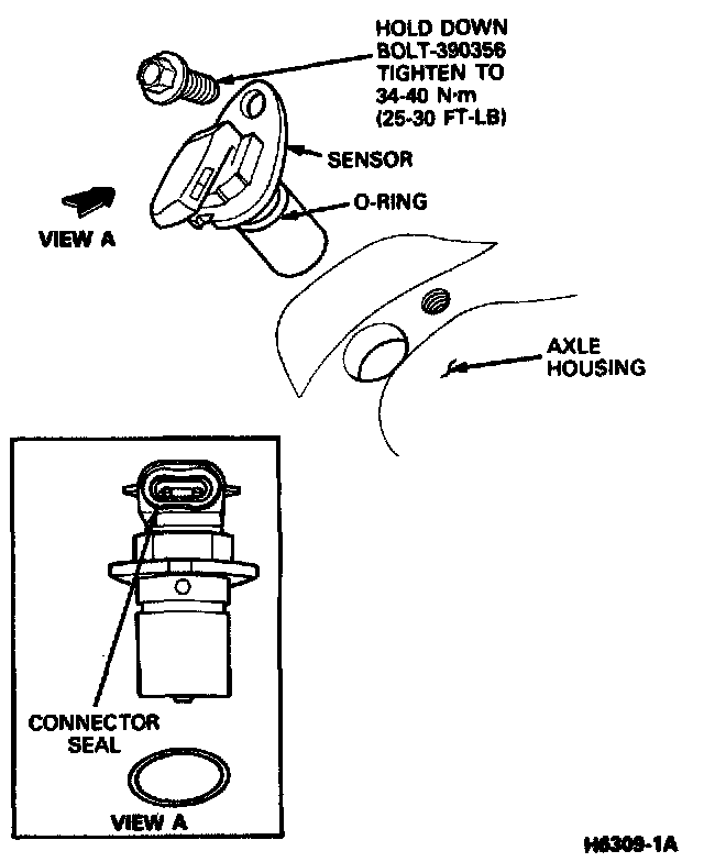 1. If new sensor is to be instal led, lightly lubricate 0-ring with motor oil.a. Firmly grasp sensor at sides (do not install by applying force on connector) and push into axle housing, aligning mounting flange hole with threaded hole in axle housing.