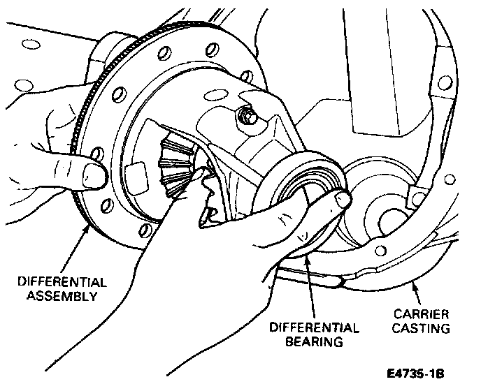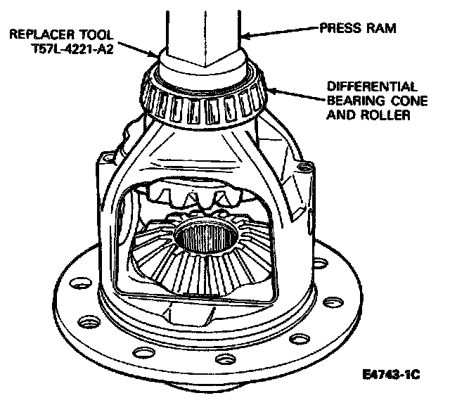 5. Install new differential bearings on the case hubs using Replacer Tool, T57L-4221-A or equivalent and install the differential assembly in the carrier without the ring gear.