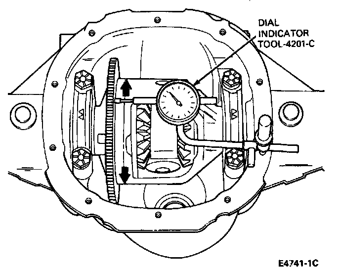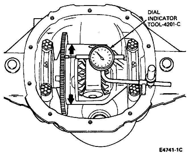 3. Check the runout of the differential case flange with a dial indicator Tool-4201-C. If the runout is within specification, (Max. 0.003 inch), install a new ring and pinion gear. If the runout exceeds specification, the ring gear is true and the concern is due to either a damaged case or bearings. Visually inspect the bearings. If bearings are not damaged replace both the case and bearings. Recheck the runout with new parts (case and bearings). Visually inspect the excitor ring for damage and replace if required.