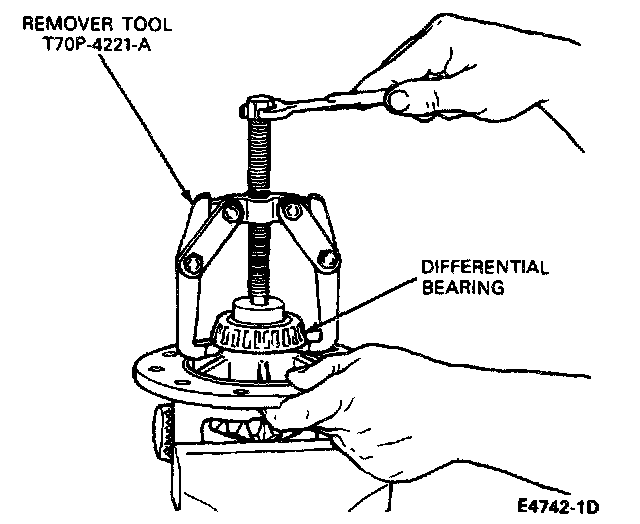 4. Remove the differential case from the integral carrier and remove the differential bearings from the case using Remover Tool T7OP-4221-A or equivalent.