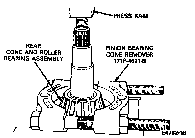 To remove the pinion rear cone and roller bearing assembly, use the Pinion Bearing Cone Remover, T71P-4621-B or equivalent as shown.