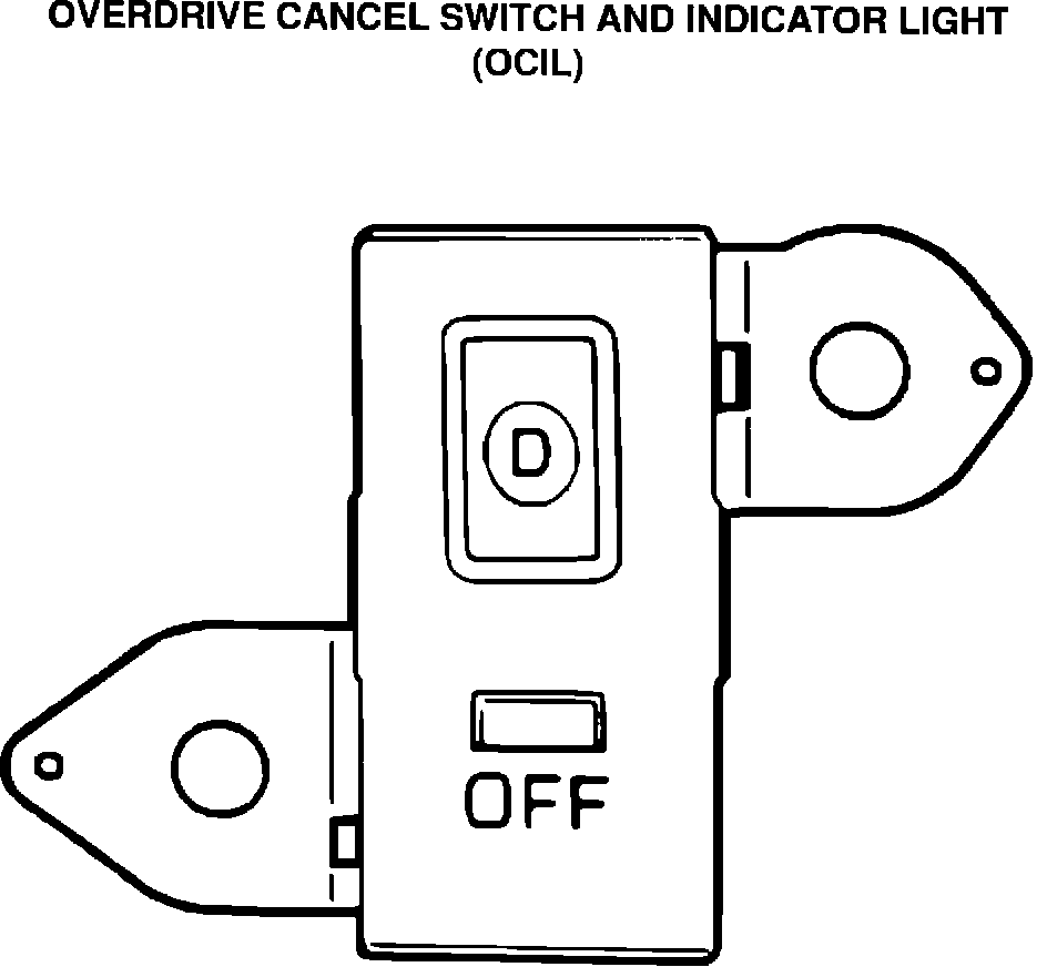 Description: The overdrive cancel switch is a momentary contact switch. When this switch is pressed, the indicator light comes on and a signal is sent to the processor assembly. The processor then energizes solenoid 4, applying the coast clutch and cancelling fourth gear operation.
