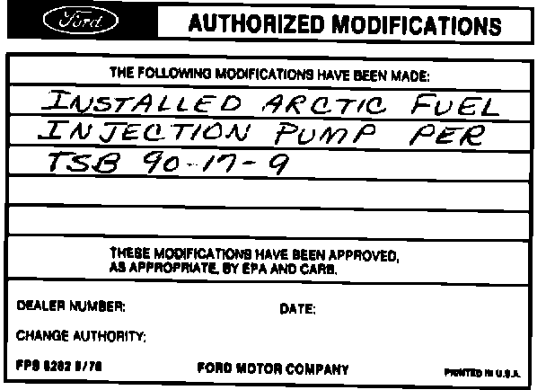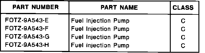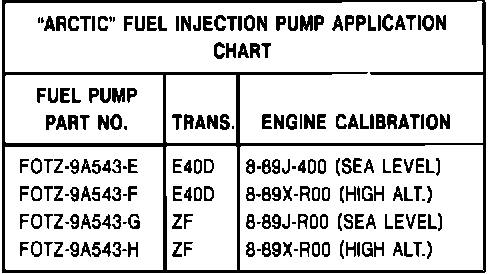 CAUTION: THE FOLLOWING AUTHORIZED FORD SERVICE "ARCTIC" FUEL INJECTION PUMP MUST BE INSTALLED IF ANY OF THE CONDITIONALLY ACCEPTABLE DIESEL FUELS ARE USED. SOME POWER LOSS SHOULD BE EXPECTED. FAILURE TO INSTALL THE "ARCTIC" FUEL INJECTION PUMP IN CONJUNCTION WITH THE USE OF THESE FUELS IS NOT APPROVED OR WARRANTED BY FORD.