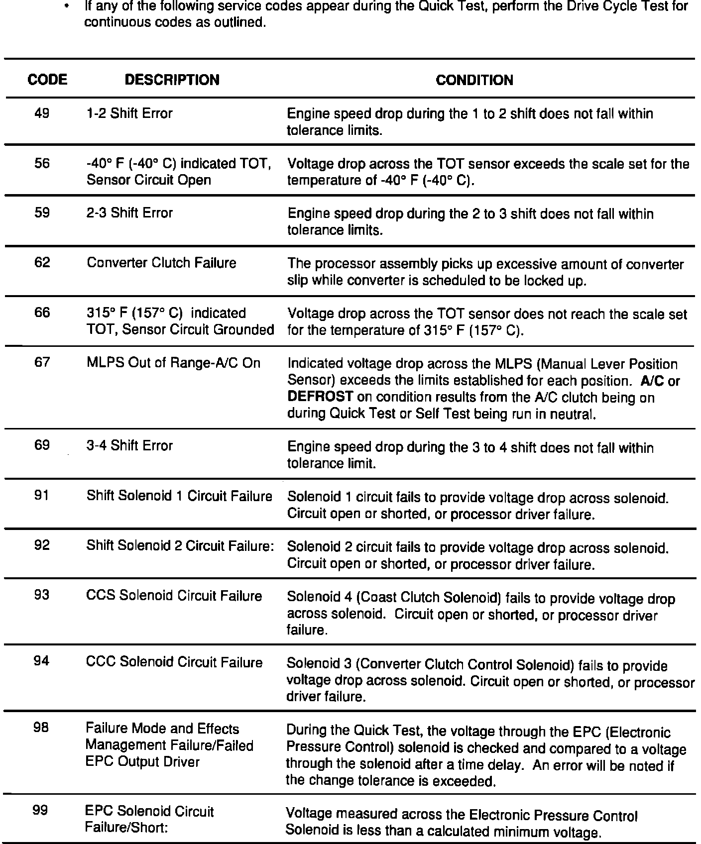 Test service code chart first: 49, 56, 52, 66, 67, 69, 99. The corresponding Pinpoint Tests for the codes will check the processor and wiring harnesses to the solenoid body. If these tests fail to locate a fault, go to the "Drive Cycle Test" for codes 49, 59 and 69 or the Electrical Diagnosis Chart Index in Section 17-09 of the Truck Shop Manual. Repeat the Quick Test after completing service on these codes.