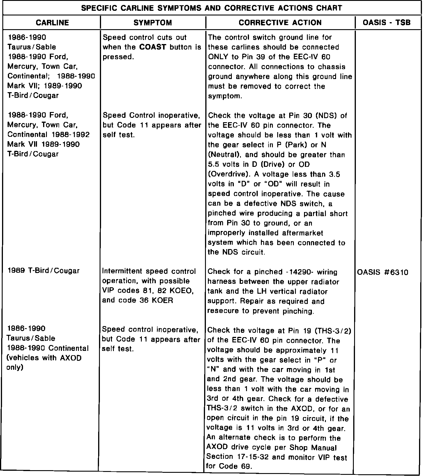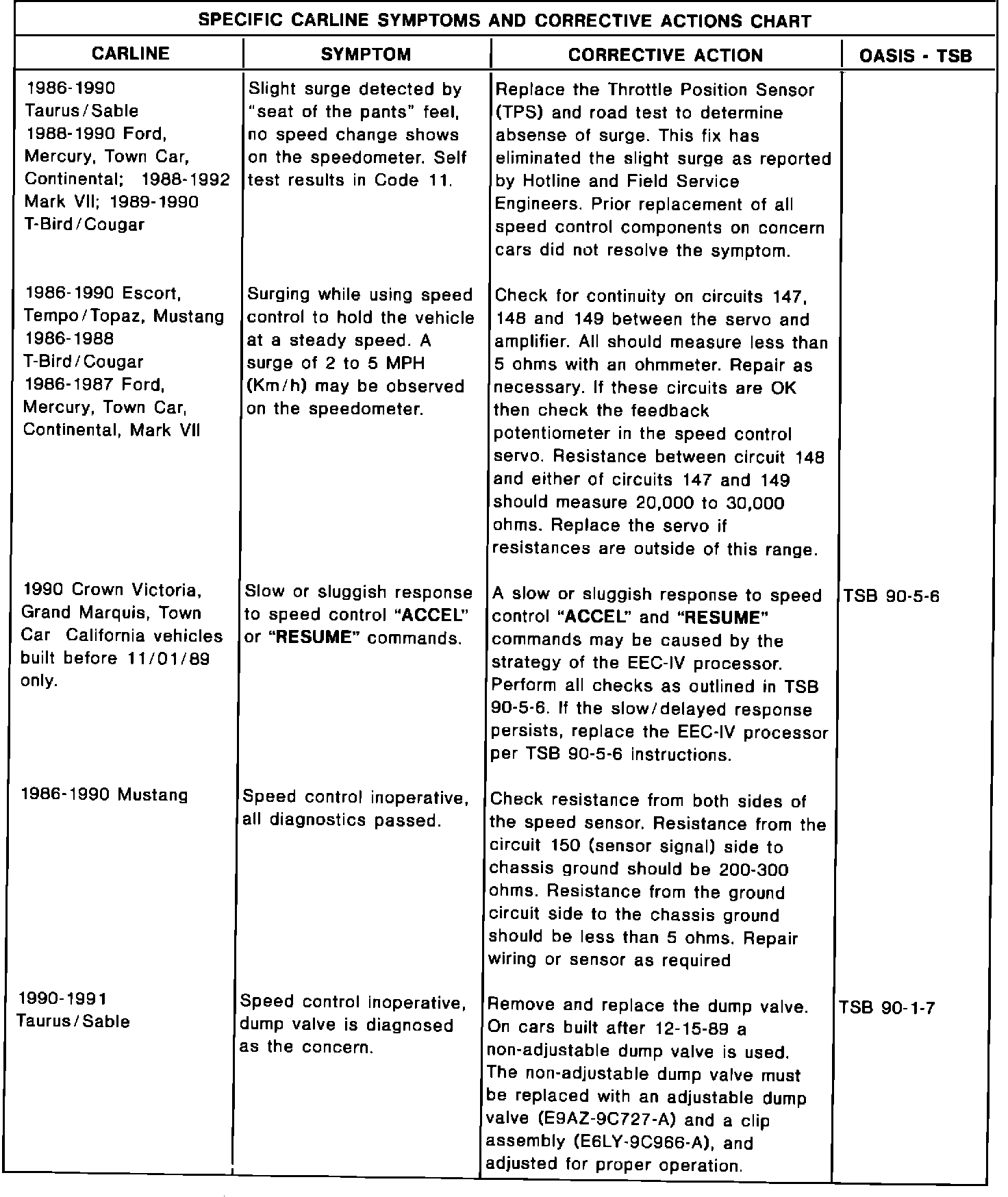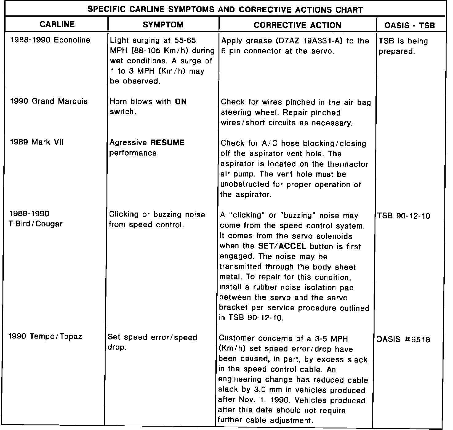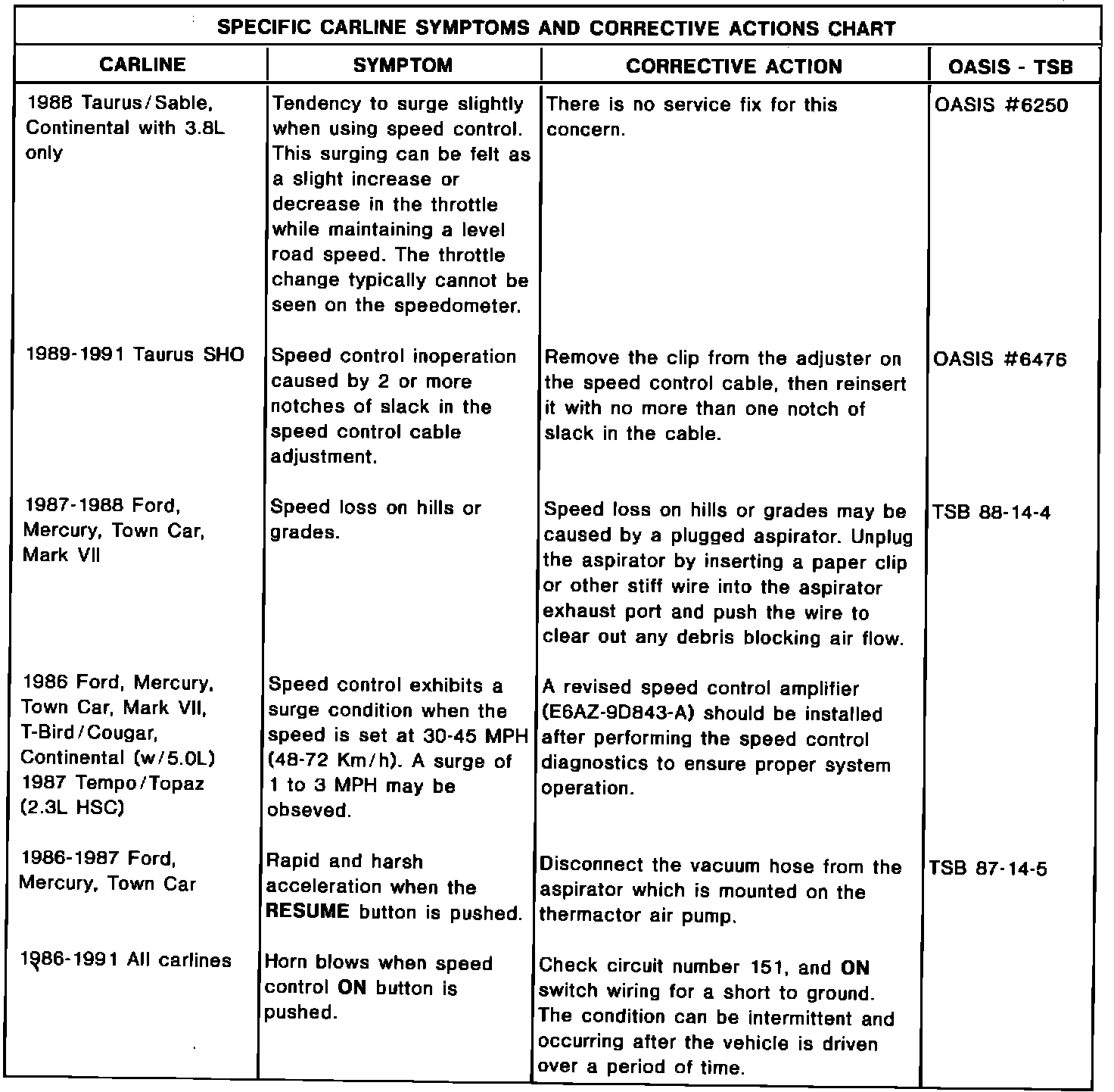 The following charts are a summary of speed control concern symptoms as reported. The corrective action for each is shown, as well as the TSB or OASIS number (if any) as a reference.