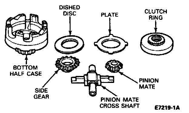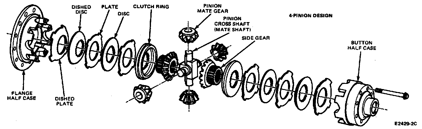 FIG. 2 Four Pinion Limited-Slip Differential-Model 702U and 7OHD Powerlok. Design with Radial Grooves on Plates, Outer Dished Plate, and One Dished Disc per Clutch Pack (See Fig. 16 for Newer Design):