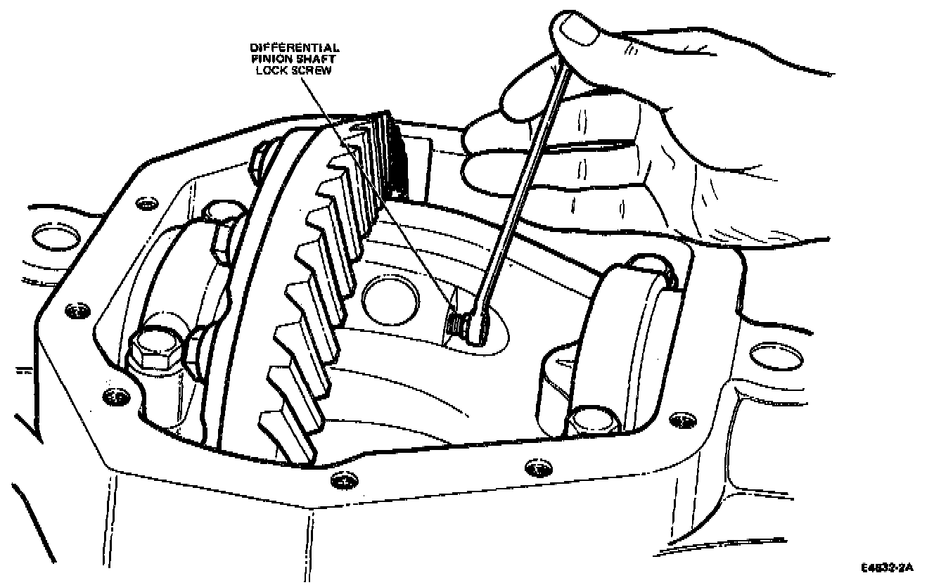 3. Install pinion mate shaft. Be sure lockscrew hole of the shaft is lined up with the lockscrew hole in case. Be sure pinion gear side washers are in correct position.