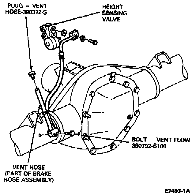 7. Connect the hydraulic brake hose and bleed the brakes. Also connect the axle vent hose to the axle fitting on Econoline vehicles. The F-Super Duty axle vent hose is part of the brake hose assembly and uses a special "flow" bolt to secure the hose block assembly to the axle.