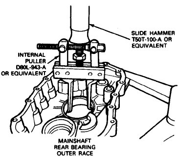 2. Using Slide Hammer T50T-100-A or equivalent and Internal Puller D80L-943-A or equivalent, Remove mainshaft rear bearing outer race from rear case.