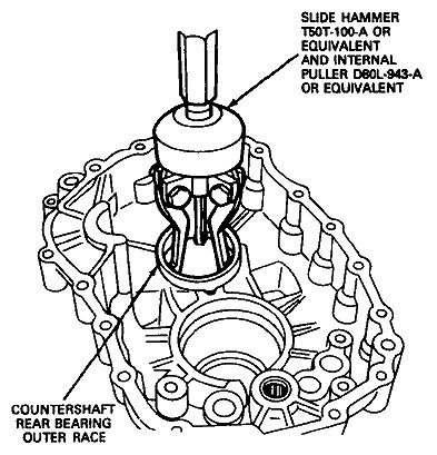 4. Using Slide Hammer T50T-100-A or equivalent and bearing Cup Puller T77F-1102-A or equivalent, remove the countershaft rear bearing outer race from rear case.