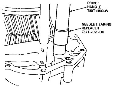 5. Install the countershaft bearing outer race with hand driver T80T-4000-W and bearing cup replacer T73T-4222-A until it seats against its stop.