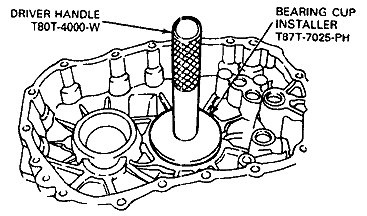 7. Using Driver Handle T80T-4000-W and bearing Cup replacer T87T-7025-PH, Tap the bearing cup into its bore until it seats against its stop.