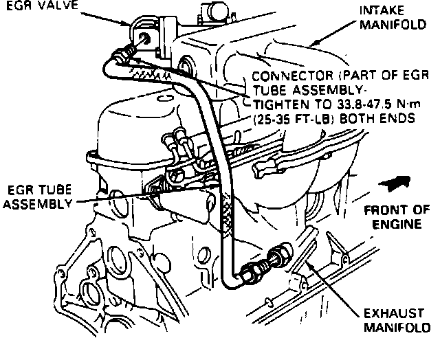 5. Install the EGR tube between the EGR valve and the rear exhaust manifold. The tube is routed between lower intake runners No. 4 and No. 5. Tighten both fittings to 33.8-47.5 Nm (25-35 ft lb).