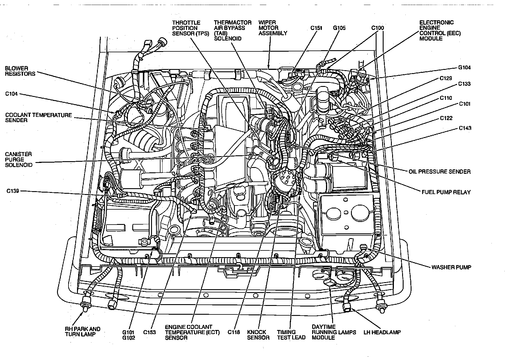 The Fuel Pump Relay is located under the plastic shield at the air cleaner support bracket.