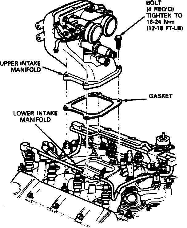 3. Install upper intake manifold and throttle body assembly to lower manifold ensuring gasket remains in place (if alignment studs are not used).