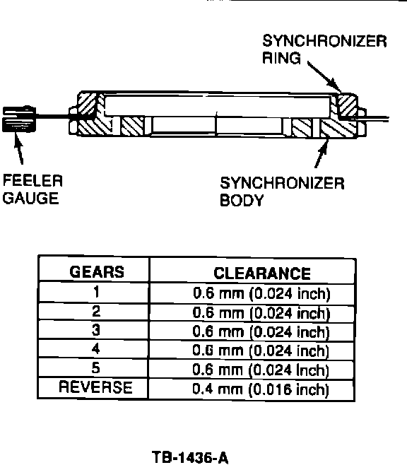 c. If the clearance is less than 0.6 mm (0.024") for the 3rd-4th, 1st-2nd and 5th synchronizer assemblies and 0.4 mm (0.016") for the reserve synchronizer assemblies, replace the synchronizer ring, synchronizer body or both if required to bring to within specification.