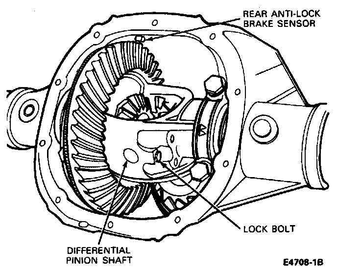 2. Position the differential pinion shaft through the case and pinions, aligning the hole in the shaft with the lock bolt hole. Apply Loctite (EOAZ-19554-B or equivalent) to the lock bolt threads. Install lock bolt and tighten to 20-40 Nm (15-30 ft-lbs).